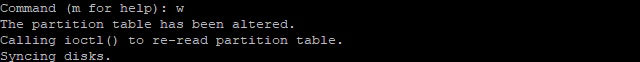 확인된 파티션 정보가 맞다면 w를 입력하여 파티션 정보를 하드디스크에 써 주면 파티션 설정은 완료되었습니다.