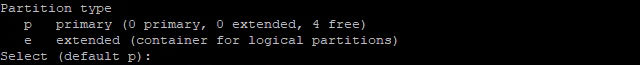 아래와 같이 파티션 종류를 손택하도록 나옵니다. p를 입력하여 새로운 프라이머리 파티션을 만들어 줍니다.