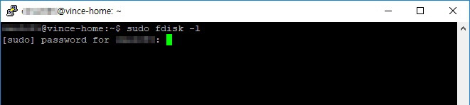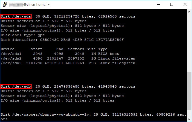 파티션 설정은 디스크의 공간을 나누어 주는 작업으로 공간 전체를 하나로 설정할 수도 있고 필요에 따라 나누어 설정할 수도 있습니다. 우선 우분투에 연결된 하드디스크를 확인하기 위해 다음 명령어를 입력하도록 합니다. fdisk 명령어를 사용하기 위해서는 root 권한을 사용해야 하기 때문은 sudo 명령어를 함께 사용하여야 합니다.