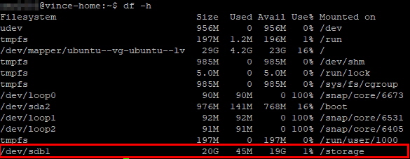 이제 추가한 파일시스템 테이블을 마운트 하기 위해 'sudo mount -a' 명령어를 실행해 줍니다. 그리고 'df -h' 명령어를 실행해 주시면 아래와 같이 정상적으로 마운트 된 것을 확인할 수 있습니다.