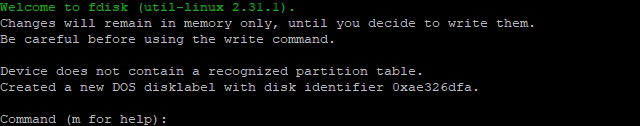 아래와 같이 fdisk 프로그램이 가동되고 '쓰기'명령을 가기 전에는 바뀌는 내용을 메모리에 임시 기록된다고 나오며 그 아래는 아무 파티션 설정이 없다고 나오는데 만약 사용했던 하드디스크를 연결하며 아래의 메시지는 나오지 않을 것입니다. command에 n을 누르고 엔터를 쳐서 새로운 파티션 테이블을 만들어 보도록 하겠습니다.