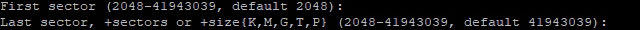 파티션을 시작하는 첫번째 섹터를 선택하라고 나오면 엔터를 눌러 기본적인 가장 처음 섹터를 할 수 있고 임의로 섹터를 선택할 수도 있습니다. 그리고 마지막 섹터도 선택해야 합니다. 마지막 섹터도 엔터를 눌러 가장 마지막 섹터를 선택할 수 있습니다.