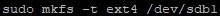 명령어는 mkfs이며 이 명령어를 통해 여러 파일 시스템으로 포맷할 수 있습니다. 저는 ext4로 포맷 작업을 하도록 하겠습니다. mkfs 명령어도 루트 권한이 필요하기 때문에 sudo 명령어를 같이 사용해 주어야 합니다.