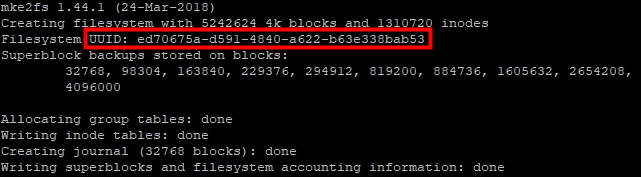 포맷이 완료되면 아래와 같이 포맷 정보를 확인할 수 있습니다. 아래 이미지의 빨간 네모 친 UUID는 다음 마운팅 작업에서 부팅 시 자동 마운트를 위해 필요한 정보입니다.