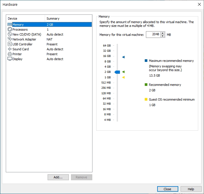 하드웨어 설정에서는 메모리, 프로세서, 네트워크 등 여러가지 설정을 추가 수적 그리고 제가까지 하실 수 있습니다. 위의 화면은 메모리 설정으로 기본 추천 용량이 설정되어 있고 늘리거나 줄일 수 있습니다. 최고 용량 이상으로 메모리 사용량을 설정 할 경우 컴퓨터 운용시 문제가 발생할 수 있습니다.