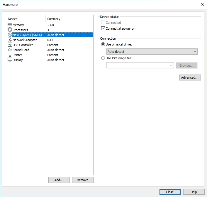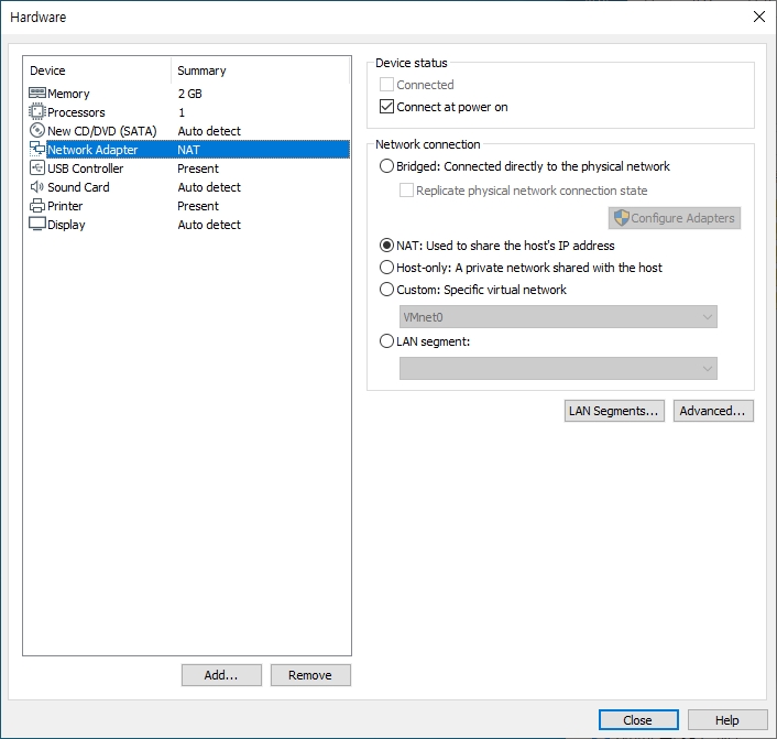 이번 화면에서는 가상 머신에서 빠져서는 안되는 설정인 네트워크에 대해 설정 할 수 있습니다. 네트워크 설정은 기본적으로 프릿지모드, NAT모드, 호스트온리 이렇게 설정할 수 있습니다. 보통 NAT모드를 통해 VMware가 실행되고 있는 컴퓨터 내에서 새로운 사설 아이피를 사용하여 네트워크를 이용할 수 있습니다. 또 필요에 따라서는 실제 물리적인 랜카드와 연결하는 브릿지모드, 실제 컴퓨터와 동일한 네트워크 대역을 사용할 수 있는 호스트온리 모드로 사용하실 수도 있습니다. 이 네트워크 설정 부분은 나중에 다시한번 글을 통해 정리해 보도록 하겠습니다.