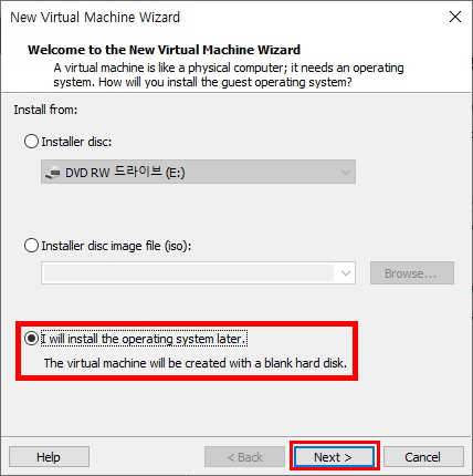 위의 화면에서 운영체제 이미지 파일을 선택하셨다면 다음으로 진행하셔도 무관합니다. 저는 이미지 없이 가상 머신을 만드는 방법 또한 설명해 드리기 위해 다시 뒤로 돌아왔습니다. 그럼 위와 같이 나중에 운영체제 설치하기를 선택하시고 진행을 해주세요.
