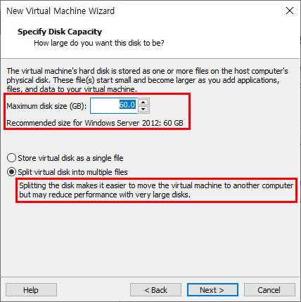 그다음은 디스크 공간을 만들어 주어야 합니다. 이 디스크 공간은 가상공간으로 선택하신 운영체제의 추천 용량으로 먼저 나오게 됩니다. 이 용량은 늘일 수도, 줄일 수도 있습니다. 아래의 내용은 이 가상 디스크를 하나의 파일로 저장할 것인지 아니면 나누어 저장할 것인지를 물어보는데요. 가장 빠르게 사용하고 싶으시면 하나의 파일로, 여러 컴퓨터를 옮길 수 있는 안정성을 요구하신다면 나누어 저장을 하라고 추천하는데 제 개인 적인 추천은 나누어 저장하시는 것을 추천드립니다.