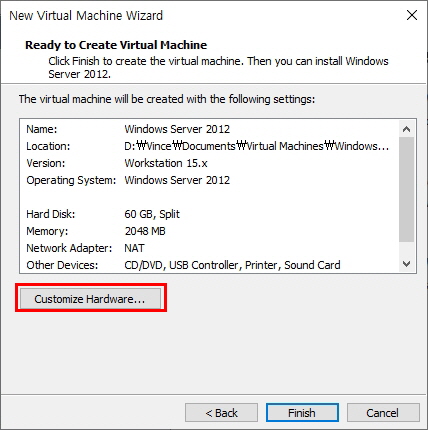저장용량 설정을 마치시면 위와 같이 다른 장치들의 설정을 확인 할 수 있는 화면이 나오고 마무리 할 수 있습니다. 마무리하기 전에 하드웨어 설정을 눌러서 한번 살펴 보도록 하겠습니다. 원치 않으시는 분들은 마침을 눌러 마무리 해주시면 가상머신을 사용하실 수 있습니다.