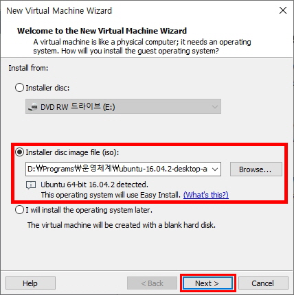 위의 이미지와 같이 운영체제 설치 ISO 파일을 선택해주시거나 실제 PC의 CD/DVD를 사용하여 운영체제를 설치할 수 있습니다. 요즘 대부분의 사용자분들은 이 ISO 파일을 통해 설치하실 것이라고 생각됩니다. ISO 파일을 선택해 주시면 위와 같이 VMware가 자동으로 운영체제를 인식할 수도 있습니다. 저는 우분투를 넣어봤는데 제대로 우분투를 인식하고있습니다.