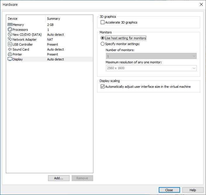 이밖에도 USB설정, 사운드카드 설정, 프린터 설정 및 디스플레이 설정을 할 수 있습니다. 각각의 하드웨어는 아래의 추가.삭제 버튼을 통해 삭제 후에 나중에 필요시에 추가하여 사용할 수 있습니다.