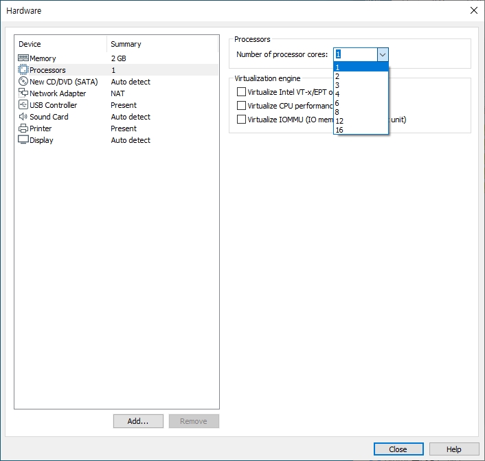위의 화면은 프로세서의 개수를 설정 할 수있습니다. 추가로 사용할 가상엔진도 설정 할 수 있습니다. 운영체제 설치 후에 변경하기 보다 운영체제 설치 이전에 설정하여 사용하시는것을 추천 드립니다.