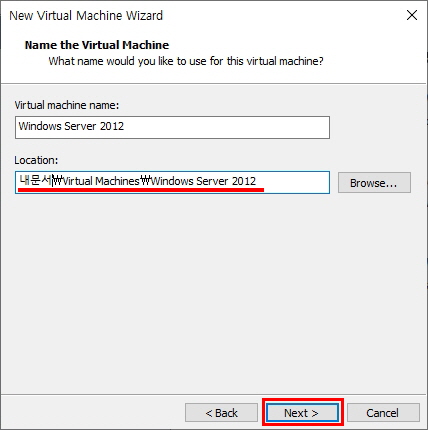 다음으로 가상 머신이 설치될 위치와 이름을 지정해 주셔야 합니다. 기본적으로 본인의 내 문서 폴더 안에 Virtual Machine이라는 폴더가 생성되고 그 아래의 각각의 가상 머신의 폴더를 만들어서 진행하게 됩니다. 만약에 새로운 위치를 선택하시려면 선택하시는 폴더의 아래에 폴더를 만들어 가상 머신이 만들어지는 것이 아니기 때문에 생성하시는 가상 머신의 이름으로 폴더를 만들어서 해당 폴더를 선택하여야 여러 가상 머신이 만들어지면 관리하시기 좋습니다.